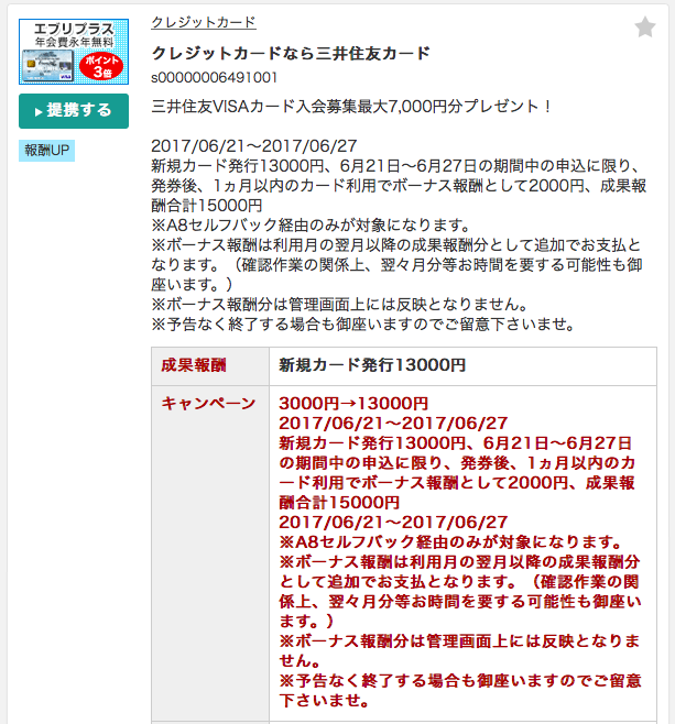 このようにキャンペーン中で大幅アップしているのが狙い目ですね。カードを作っただけで報酬13,000円ってすごいですよね。